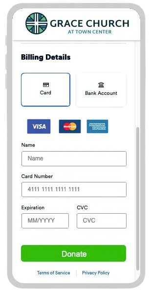 Accept donations via credit cards, debit cards, bank account, and Apple Pay.